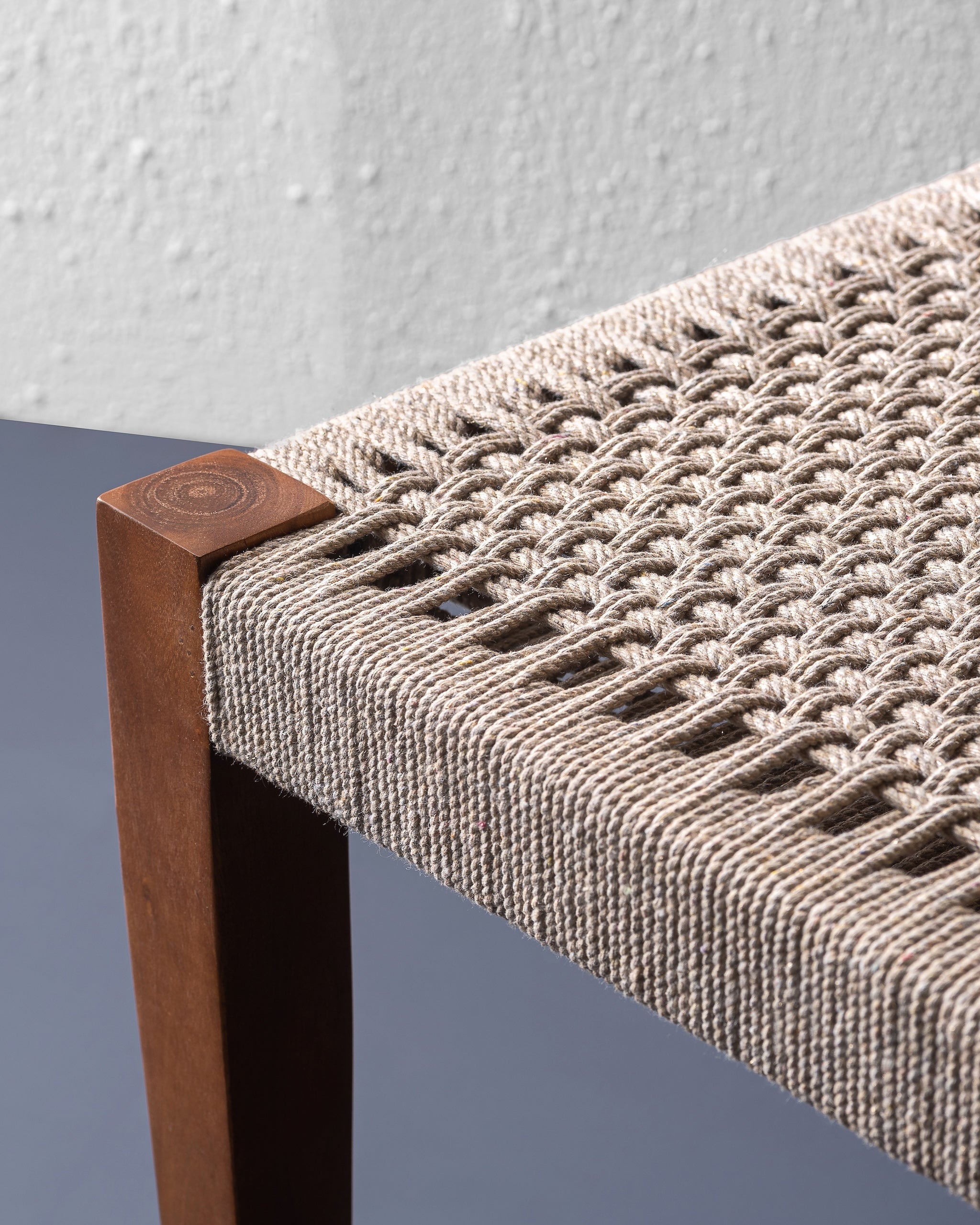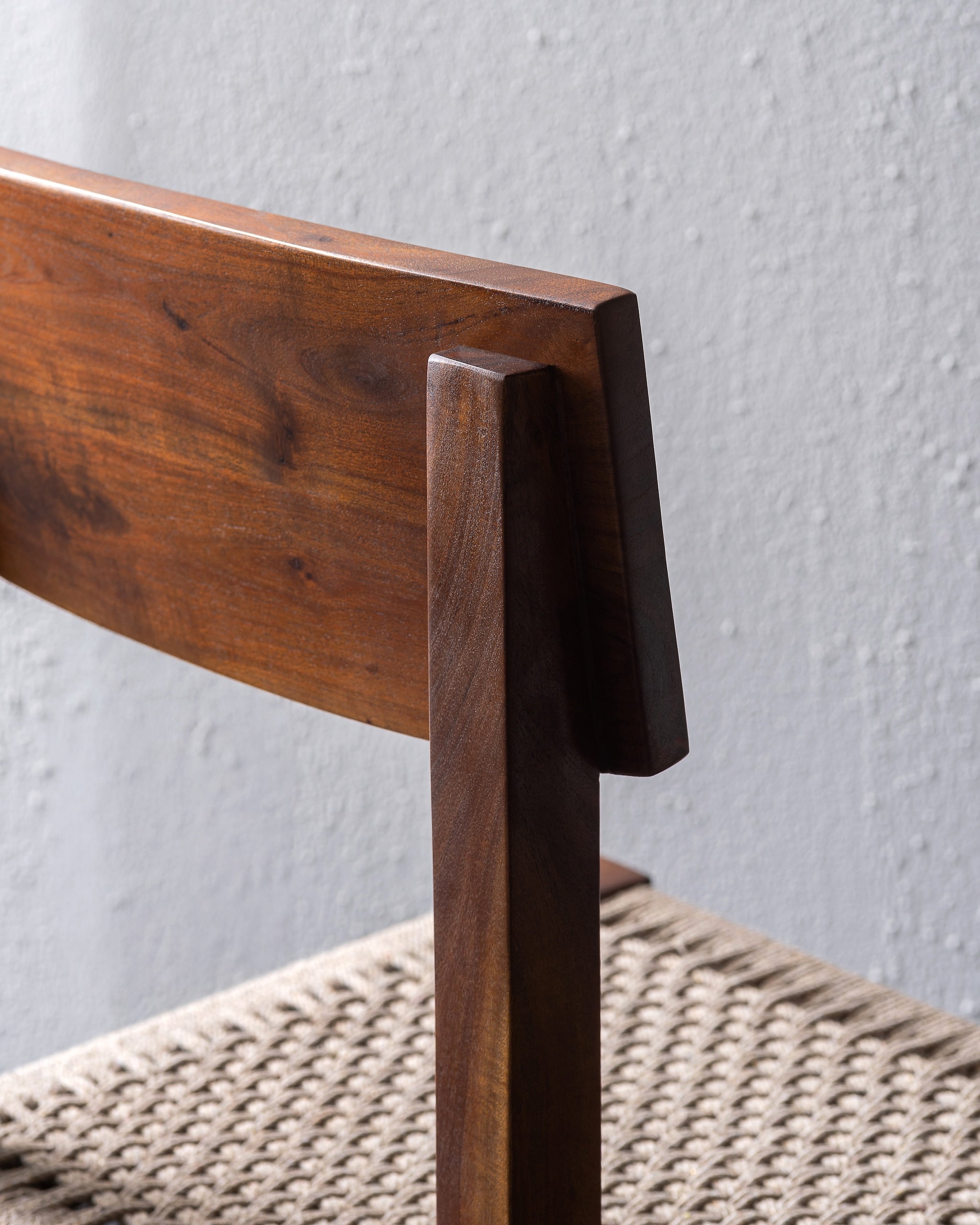 Cut from solid acacia hardwood, the KONA Dining Chair sits with ease beside the dining table. Its seat is handwoven in rope, a pattern that carries forward the craft of the charpai and mudda, furniture that has served Indian homes for centuries. The backrest is a single plank, angled for comfort, its grain left open to the eye.